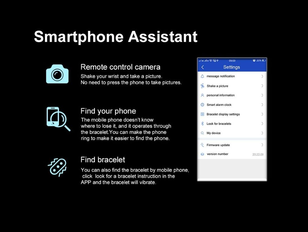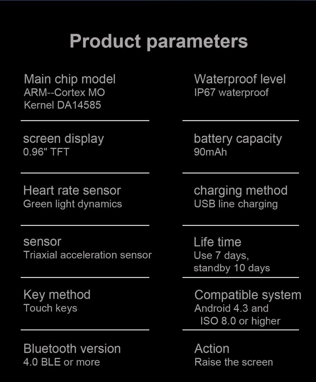 - Function:Blood Pressure,Passometer,Sleep Tracker,Push Message,Heart Rate Tracker,Alarm Clock,Remote Control,Social Media Notifications,Message Reminder,Call Reminder